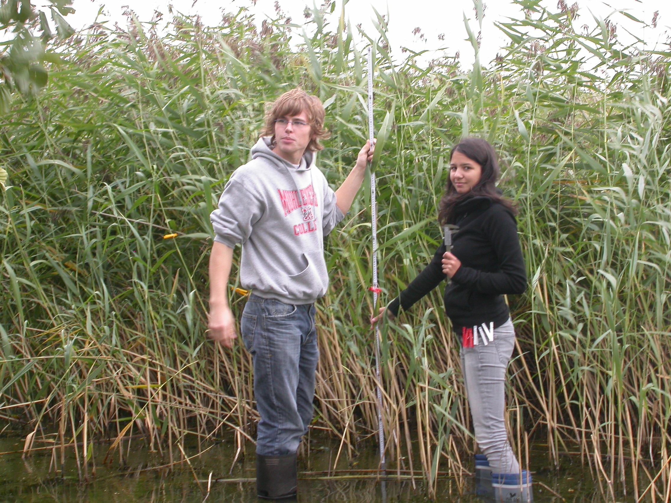 Die Tiefe wird an dem Ansatz des Schilfgürtels zum Wasser mit Hilfe eines Stabes und Maßband gemessen.
